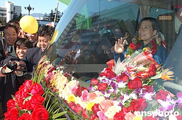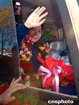 十月十六日上午,中國首位航天員楊利偉回到位于北京西北郊的中國航天城航天員公寓。大批航天城員工和群眾夾道歡迎楊利偉凱旋。中新社記者:張煒