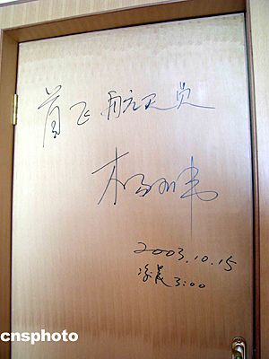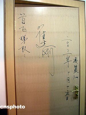 二00三年十月十五日凌晨,中國(guó)飛天第一人楊利偉及首飛梯隊(duì)航天員于“神舟”五號(hào)載人飛船發(fā)射前,在酒泉衛(wèi)星發(fā)射中心航天員公寓“問(wèn)天閣”的住房房門(mén)上簽名留念。中新社記者 孫自法 攝影報(bào)道