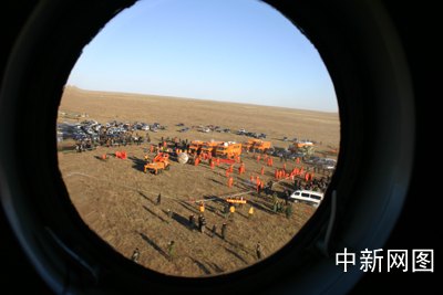 “神舟”五號載人飛船著陸現(xiàn)場。作者:孫陽