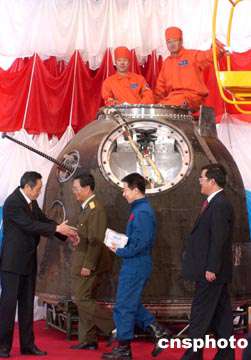 十月十八日,中國神舟五號載人飛船回收艙搭載物品開艙儀式在中國航天科技集團(tuán)公司北京空間技術(shù)研制試驗中心舉行。中國首位航天員楊利偉向相關(guān)部門代表轉(zhuǎn)交從太空歸來的“貴賓”。搭載物品中包括來自臺灣地區(qū)的作物種子。中新社記者:張煒