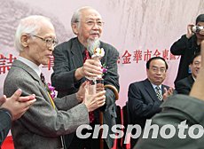 第九屆國際詩人筆會十月中旬在浙江金華開幕,來自亞洲、美洲、大洋洲10多個國家和地區(qū)近100位名家詩友會聚金華中國茶花文化園。三位對中國當(dāng)代詩歌做出卓越貢獻(xiàn)的詩歌大家馮至、鐘鼎文、余光中獲“中國當(dāng)代詩魂金獎”。圖為著名詩人文懷沙向余光中頒獎。作者:胡旭明