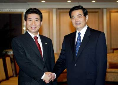中新網(wǎng)10月20日電 新華網(wǎng)報(bào)道說(shuō),中國(guó)國(guó)家主席胡錦濤19日在曼谷會(huì)見(jiàn)了韓國(guó)總統(tǒng)盧武鉉。