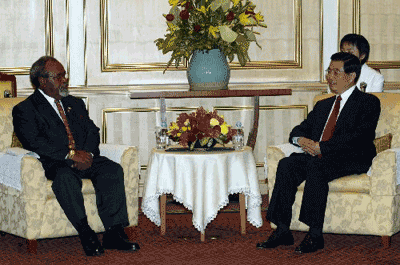 中新網(wǎng)10月20日電 新華網(wǎng)報道說,中國國家主席胡錦濤19日下午在曼谷會見了巴布亞新幾內(nèi)亞總理索馬雷。胡錦濤說,中國和巴新兩國人民有著長期友好交往的歷史。近年來通過我們雙方的共同努力,兩國關(guān)系順利發(fā)展。雙方高層交往不斷,經(jīng)貿(mào)合作成果顯著,巴新已成為中國在南太島國中最大的貿(mào)易伙伴。在太平洋島國論壇、亞太經(jīng)合組織、聯(lián)合國等地區(qū)和國際組織中,我們雙方也進(jìn)行了密切的合作。
