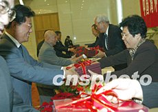全國政協(xié)副主席羅豪才(右二)、中國海外交流協(xié)會常務(wù)副會長陳玉杰(右一)等為理事會領(lǐng)導(dǎo)成員、常務(wù)理事頒發(fā)聘書。中新社記者:滿會喬