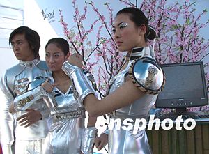 首屆中國國際網(wǎng)絡(luò)文化博覽會(huì)十月二十三日在北京中華世紀(jì)壇開幕,近百家網(wǎng)絡(luò)知名企業(yè)和網(wǎng)絡(luò)媒體參展,上海一家網(wǎng)絡(luò)游戲運(yùn)營公司的模特身著《破碎銀河系》網(wǎng)絡(luò)游戲中角色的服裝在展臺(tái)前表演。中新社記者:張勤
