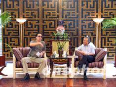 曾經(jīng)作為主招待酒店接待了兩屆博鰲亞洲論壇年會的博鰲金海岸溫泉大酒店,今年不再作為主會場,但是中國國家領(lǐng)導(dǎo)人與各國政要的會見活動依然在此舉行。今天下午,在位于博鰲水城的C島別墅,記者參與了會見演練:主會見廳是有南國風(fēng)情木百葉窗圍合的“鳥鳴軒”,酒店的工作人員與參加演練的“貴賓”在反復(fù)磨合接待程序,連如何推拉木門都有動作標(biāo)準(zhǔn)。