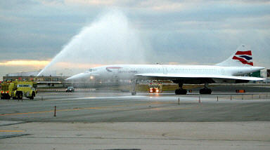 10月23日,一架“協(xié)和式”超音速客機最后一次降落在美國紐約肯尼迪機場,這架飛機將在星期五飛返倫敦,完成“協(xié)和式”的最后一次航程。當這架“協(xié)和式”以其特有的轟鳴聲降落在肯尼迪機場時,機場的消防車噴出水柱,以示歡迎。