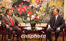 國務(wù)院僑辦副主任趙陽(圖右)24日在重慶會見菲律賓著名華人實(shí)業(yè)家陳永栽,趙陽表示,陳永栽先生投資設(shè)立的新聯(lián)商業(yè)銀行重慶分行將對重慶乃至西部地區(qū)經(jīng)濟(jì)發(fā)展起積極作用。作者:鄒輝