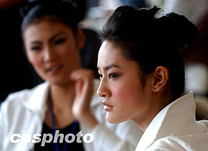 參加新絲路世界模特大賽的中國(guó)小姐,十月二十八日在以古色古香的發(fā)式出席杭州大廈的見面會(huì)。中新社記者:賈國(guó)榮