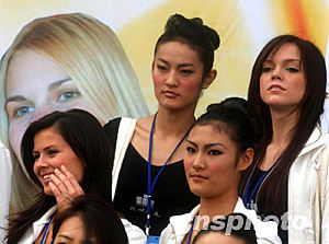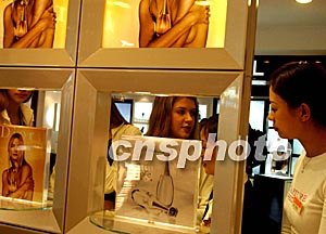 參加中國(guó)新絲路世界模特大賽的俄羅斯小姐,十月二十八日逛杭州大廈商場(chǎng),采購(gòu)法國(guó)名牌香水。中新社記者:賈國(guó)榮