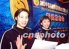 2003年中國杯世界花樣滑冰大獎(jiǎng)賽將于十一月初在北京舉行,來自十四個(gè)國家的六十四名優(yōu)秀運(yùn)動(dòng)員將參加這一重要國際賽事的角逐。圖為剛剛在美國站比賽中獲得雙人滑冠軍的中國選手龐清、佟健在二十九日舉行的新聞發(fā)布會(huì)上。中新社記者:武仲林