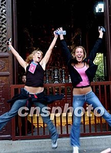 參加中國新絲路世界模特大賽的南美小姐,十月二十九日游覽杭州靈隱寺時(shí)在金剛像前歡跳。中新社記者:賈國榮
