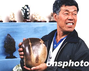 山西省垣曲有一位奇石收藏愛好著,不久前他在黃河小浪底水庫中發(fā)現(xiàn)了一顆圓石頭,石頭上有一個和“神州五號”載人火箭升空時的情景異常相似。2003年10月下旬,他為慶!吧裰菸逄枴钡陌l(fā)射成功,特將這塊奇石拿出來進行展覽。張旦 攝