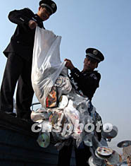 北京警方十月三十日將近期收繳的各類淫穢盜版光盤三十萬張予以銷毀。中新社記者:任海霞