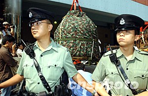 神舟五號宇宙飛船返回艙、著陸降落傘等十月三十一日運抵香港科學(xué)館。圖為香港警察嚴(yán)加保護神舟五號展品。中新社記者:潘索菲