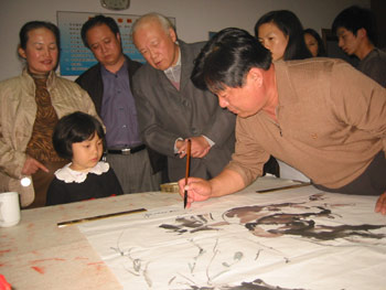 李老師非常開心,取來新的紙筆,揮毫即興做了一幅駿馬回首圖,提詞:"繁民學(xué)畫"贈(zèng)送給謝伯子,感謝他對(duì)愛心之旅的支持。