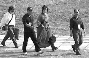 下午1點40分,記者看到劇組一位負責(zé)人怒氣沖沖從大殿跑到場外打電話:“怎幺回事?說好1點半,可現(xiàn)在還沒來!全組都在等……”10分鐘后,記者見到兩輛轎車開入秦王宮,一位身著大紅長裙,盤著高高發(fā)髻的女子從后面一輛銀灰色的尼桑車上下來,兩名保安和助理、化妝師立即圍在左右。千呼萬喚,劉曉慶終于來了!