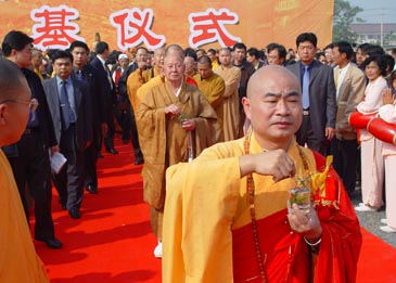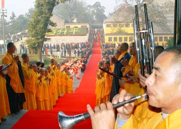 昨天在大明寺棲靈塔下舉行了盛大的紀(jì)念大會(huì)。來(lái)自國(guó)家、江蘇省有關(guān)方面的官員,鑒真東渡經(jīng)過(guò)及學(xué)習(xí)過(guò)的寺廟之諸山長(zhǎng)老法師及港澳臺(tái)和日本的客人數(shù)千人參加了大會(huì)。紀(jì)念大會(huì)由揚(yáng)州市委副書記、常務(wù)副市長(zhǎng)洪錦華主持,中央統(tǒng)戰(zhàn)部副部長(zhǎng)朱維群、國(guó)家宗教事務(wù)局局長(zhǎng)葉小文、中日友好協(xié)會(huì)副會(huì)長(zhǎng)文遲、中國(guó)佛教協(xié)會(huì)副會(huì)長(zhǎng)學(xué)誠(chéng)法師、江蘇省副省長(zhǎng)何權(quán)、省委統(tǒng)戰(zhàn)部副部長(zhǎng)、省宗教事務(wù)局局長(zhǎng)翁振進(jìn)、省臺(tái)辦副主任潘朗哉、省對(duì)外友協(xié)副會(huì)長(zhǎng)、省佛教協(xié)會(huì)會(huì)長(zhǎng)明學(xué)法師、日本駐滬總領(lǐng)事杉本信行、日本奈良唐招提寺益田快范長(zhǎng)老、臺(tái)灣佛光山開山宗長(zhǎng)星云、香港大學(xué)副校長(zhǎng)、中國(guó)工程院院士李焯芬,揚(yáng)州市府官員孫志軍、季建業(yè)、徐益民等參加了大會(huì)。