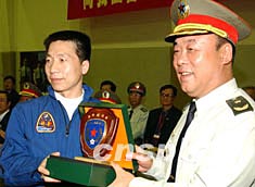 圖為在歡迎儀式上司令員王繼堂代表駐港部隊向楊利偉贈送紀(jì)念品。
