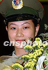 圖為駐港部隊女兵向楊利偉獻(xiàn)花。