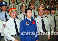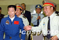 楊利偉與中國首次載人航天飛行代表團(tuán)受到駐港部隊司令員王繼堂、政委王玉發(fā)和官兵們的熱烈歡迎。