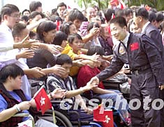 11月5日,香港特區(qū)政府在禮賓府舉行中國首次載人航天飛行代表團(tuán)歡送儀式,在場的群眾爭相與代表團(tuán)成員握手道別。中新社記者:鄧慶樂