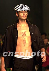 成龍系列男裝(二00四年春夏季男裝)中國揭幕式暨時裝展十一月五日晚在廣州舉行,外籍男模激情演繹“龍旋風”時裝。作者:陳文