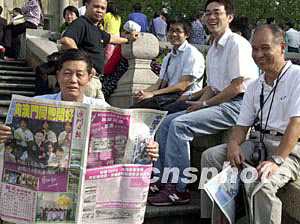 中國(guó)首飛航天員楊利偉及載人航天飛行代表團(tuán)到澳門(mén)訪問(wèn),引起澳門(mén)廣大市民的極大興趣,六日上午在大三巴牌坊前,許多市民爭(zhēng)相閱讀有關(guān)新聞。中新社記者:李剛
