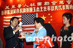 美東時(shí)間十一月六日晚,正在紐約訪問的中國國務(wù)院僑務(wù)辦公室主任陳玉杰出席了美東各界華僑華人為她率領(lǐng)的國僑辦代表團(tuán)舉行的聯(lián)合歡迎宴會(huì)席間,國僑辦主任陳玉杰向紐約僑胞贈(zèng)神舟五號(hào)飛船模型。中新社記者:陳建