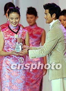 “2003中華小姐環(huán)球大賽”總決賽11月8日晚在香港會(huì)展中心舉行,圖為香港歌星郭富城為獲得最佳上鏡獎(jiǎng)的天津選手劉若菲頒獎(jiǎng)。中新社記者:錢興強(qiáng)