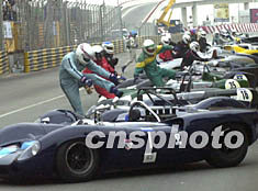 第五十屆澳門格蘭披治大賽車九日進(jìn)行正式比賽,為讓觀眾重溫大賽車的昔日情懷,金禧杯采用了利曼式起步,圖為賽手各顯神通,飛身上車。中新社記者:李剛