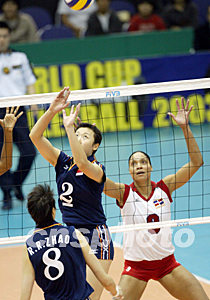 2003年11月9日,第九屆女排世界杯賽在日本舉行。多米尼加隊(duì)9號(hào)隊(duì)員阿里亞斯被查出服用興奮劑。圖為11月3日阿里亞斯(右)在同中國(guó)隊(duì)的比賽時(shí)準(zhǔn)備攔網(wǎng)。中體在線/供圖