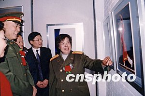 一百一十周年邵華舞臺(tái)藝術(shù)攝影作品展,十一日在山東省城濟(jì)南東方藝術(shù)館舉行,毛澤東的兒媳婦邵華(右一)少將向來(lái)賓介紹作品。作者:郝帆