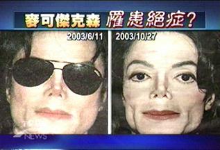 畫面左方是邁克爾-杰克遜今年6月的相片,看起來氣色還不錯(cuò)。到了10月底,卻有驚人的落差,從右方相片可以看到,邁克爾兩頰凹陷、面如菜色,眼白混濁,連整形過后的鼻梁也快撐不住了。