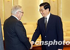 胡錦濤今天在人民大會(huì)堂會(huì)見了美國前國務(wù)卿基辛格博士,賓主進(jìn)行了友好交談。胡錦濤對(duì)基辛格長期致力于中美友好、為中美關(guān)系正;鞒龅臍v史性貢獻(xiàn)表示贊賞。