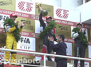 澳門(mén)第五十屆格蘭披治大賽車(chē)十六日舉行最精彩的三級(jí)方程式大賽,澳門(mén)特區(qū)行政長(zhǎng)官何厚鏵賽后親自為獲得前三名的車(chē)手頒獎(jiǎng)。中新社記者:李剛