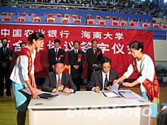 十一月十八日是海南大學建校二十周年紀念日。海南大學和中國農(nóng)業(yè)銀行十一月十八日在海大舉行銀校合作簽字儀式,中國農(nóng)業(yè)銀行在未來五年將向海南大學提供十億元人民幣的信譽貸款額度,為海南大學加快發(fā)展提供資金保障。作者:王辛莉