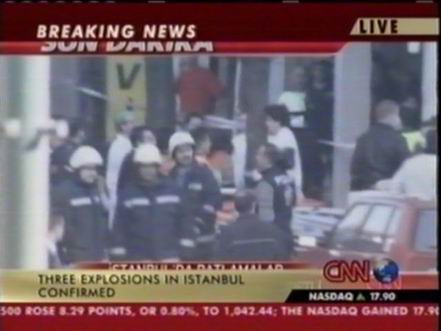 北京時間11月20日下午,位于土耳其伊斯坦布爾北部的土耳其匯豐銀行總部附近發(fā)生兩次爆炸,部分銀行建筑被摧毀。此后英國駐伊斯坦布爾領事館以及一個居民區(qū)和一座清真寺也遭到襲擊。圖為土耳其警察趕到爆炸現(xiàn)場。(春風)