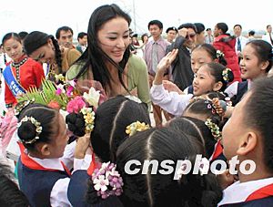 世界小姐參賽佳麗對前來歡迎的小朋友們十分親善。趙曉兵 攝