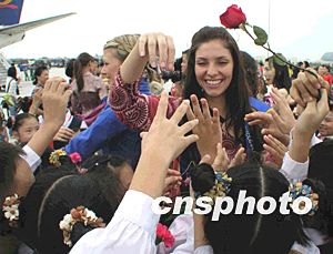 十一月二十二日,參加世界小姐二00三年總決賽的一百一十位世界小姐,乘座海航“國色天香”號專機機飛抵海口美蘭國際機場。即將代表中國參賽的關琦被前來歡迎的“小美女”們包圍。關向東 攝