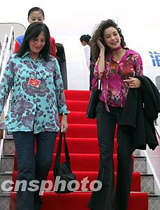 剛走下舷梯的世界小姐機構主席朱莉婭·莫莉(左)與二00二年世界小姐阿金 (右)。關向東 攝