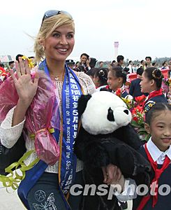 一位參賽佳麗懷抱中國國寶大熊貓紀念品。關向東 攝