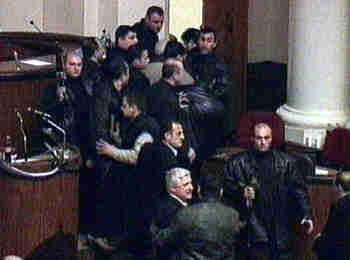 22日下午,數(shù)千名格魯吉亞反對(duì)派闖入格魯吉亞總統(tǒng)謝瓦爾德納澤正在發(fā)表演說的國(guó)會(huì)大樓內(nèi),謝瓦爾德納澤倉(cāng)促離開國(guó)會(huì)大廈。(路透社圖)