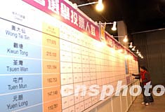 香港特區(qū)11月23日舉行區(qū)議會選舉,一萬名工作人員在四百二十多個不同的投票站,由早上七時半至晚上十時半為市民服務。圖為工作人員在張貼各區(qū)投票率和選舉結果。中新社記者:洪少葵