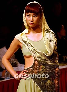 十一月二十五日在北京舉行的“杉杉杯”中國時(shí)裝設(shè)計(jì)新人獎(jiǎng)評(píng)選中,多位來自大學(xué)的年青新秀展示反戰(zhàn)主題時(shí)裝,用軍綠色搭配戰(zhàn)爭(zhēng)生活的混亂。中新社記者:賈國榮