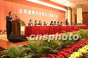 十一月二十五日,國務(wù)院僑辦主任陳玉杰在廣州東方賓館召開的全球越柬老華僑華人懇親大會上,代表中央“五僑”祝賀大會的勝利召開。中新社記者:史利