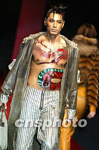喜得龍.計(jì)文波時(shí)裝發(fā)布會(huì)二十五日晚在中國(guó)國(guó)際時(shí)裝周上舉行,一名男模特身繪火龍出場(chǎng),寓意中國(guó)時(shí)裝品牌發(fā)展的龍馬精神。中新社記者:毛建軍