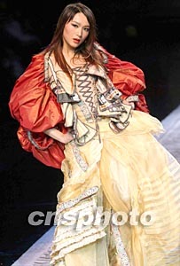 十一月二十五日晚,紫禁城的四季·馬克張春夏高級時裝發(fā)布會在北京中國大飯店舉行,著名時裝設計師張肇達通過對東方精神的探索、對中華文明的理解和把握,用服裝語言詮釋了紫禁城的獨特氣質(zhì)。圖為模特展示一款雍容華貴的時裝。中新社記者:盛佳鵬