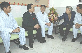 上午十時(shí)三十分,溫家寶和國(guó)務(wù)院副總理吳儀在中共北京市委書(shū)記劉淇,北京市代市長(zhǎng)王岐山陪同下,來(lái)到北京市地壇醫(yī)院。這所醫(yī)院是目前中國(guó)內(nèi)地唯一擁有艾滋病藥物研究資格的國(guó)家級(jí)臨床基地,至今已診治六百余例艾滋病患者。