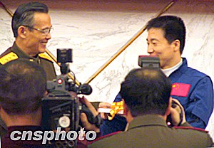 解放軍總裝備部副政委朱增泉中將、中國(guó)首位航天員楊利偉以及載人航天工程七大系統(tǒng)代表等出席新聞發(fā)布會(huì)。